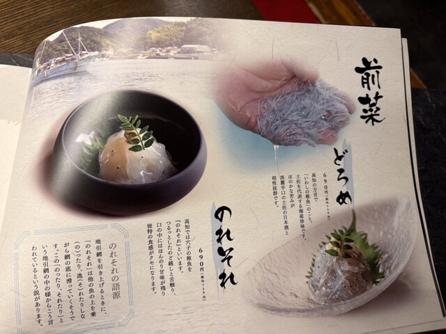 そして、高知名物「どろめ」。イワシの稚魚を大根おろしと一緒にいただく一品なんだけど、これがまたシンプルなのに味わい深い。お酒を飲みながらちびちび食べるのにぴったりで、まさに酒飲みのための一皿って感じ!焼酎と合わせたらもう最高よね。