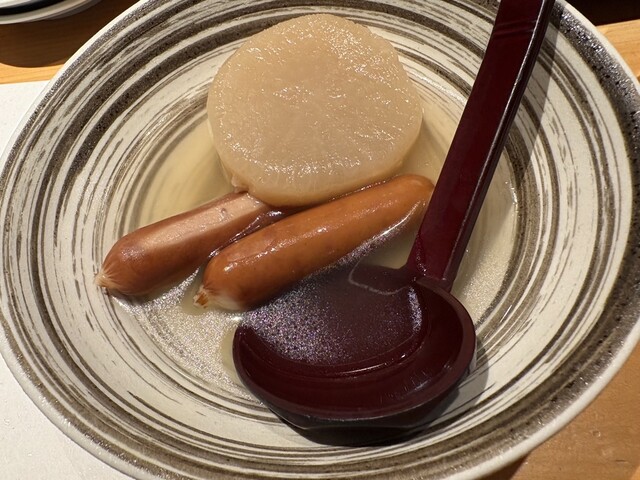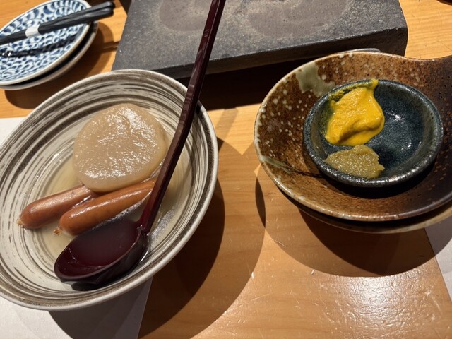 ここでおでん!この店、炉端なのにおでんがちゃんと美味しいのが最高ポイント。大根は芯まで味しみしみ、齧ると熱い出汁がじゅわ〜っと溢れてしあわせ。ウインナーはちょいジャンキーで可愛い中継ぎ、からしをつけるとキレッキレ!焼きの真面目さと、出汁の優しさ、そして遊び心のバランスがいいんだわ。