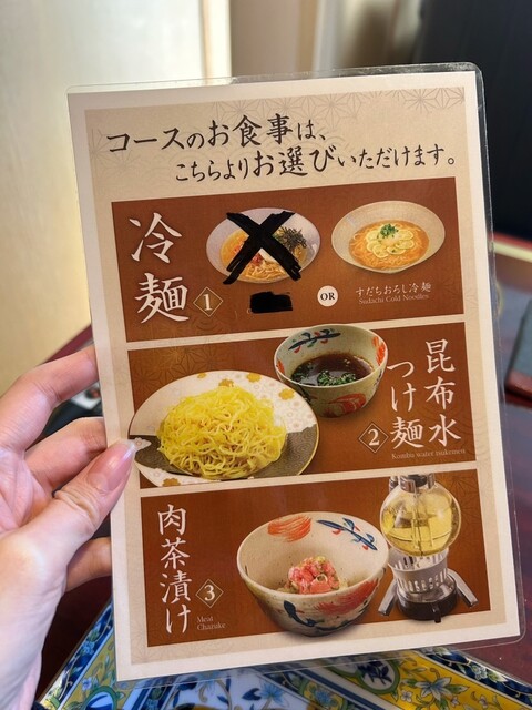 ✔︎肉茶漬け又はすだちおろし冷麵又は昆布水つけ麺(お腹に余裕のある方は全種でも可)