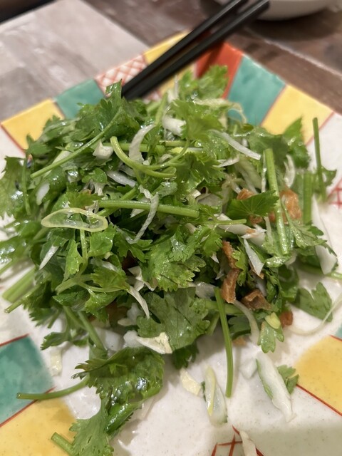 もう一つ珍しいところを紹介すると、パクチーの根っこ天がふんわり甘く美味しいです。パクチーと違い一切クセがなく、誰でも食べられるツマミにもオカズにも最高の一品です。