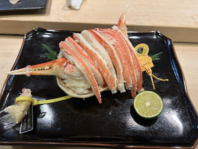 まず、この時期に美味しい松葉蟹ですが、本日は鳥取県境港産の松葉蟹でした。前回に伺った時は香住産の松葉蟹で、もちろんその時も美味しかったのですが、個人的には今日の松葉蟹の方が身がふっくらとして味も濃く好きでした。