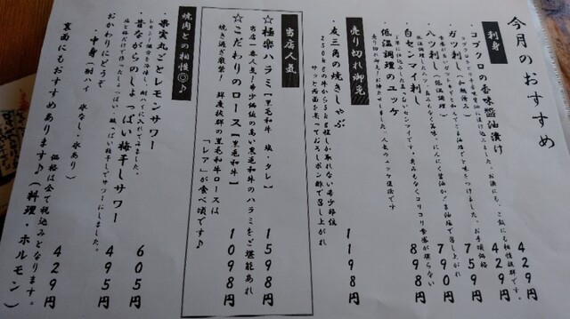ランチに行きました。ハラミランチとお摘まみ。味がとても気に入りました。一杯飲めるお店です。周りは家族連れも カップルもいたので 多様出来るのでは無いでしょうか?高級と言うより アットホームです。オプションで激辛モツの塩ネギ敢えを頼みました。美味しかったです。