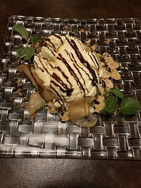 ・林檎のキャラメル煮バニラアイス添え 燻製チョコソースがけ