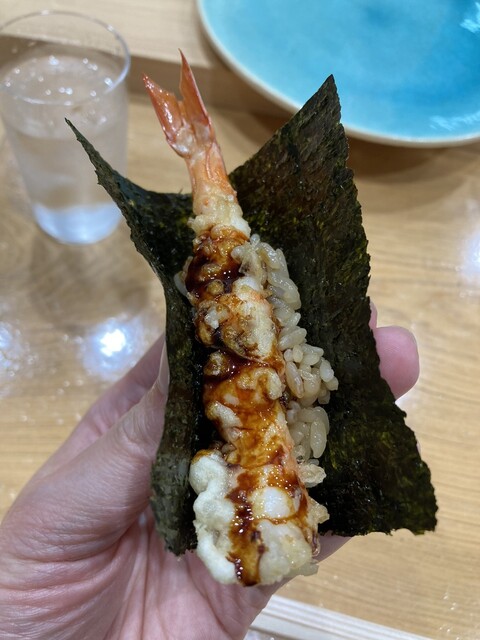 尻尾まで食べられる大きなエビで身もたっぷりと詰まっていて食べ応えがありました。アマダレも海老天の美味しさをより引き立てており、甘さもちょうど良く、上品な味わいでした。
