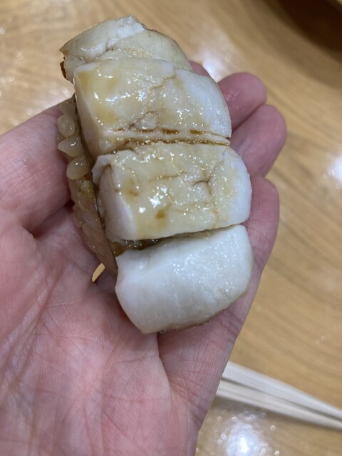 ホタテは厚みがあるのにとても柔らかく、噛むとホタテの旨味と甘味が口の中で広がりました。中に入ったワサビに負けないぐらいにホタテの甘さが際立っていました。