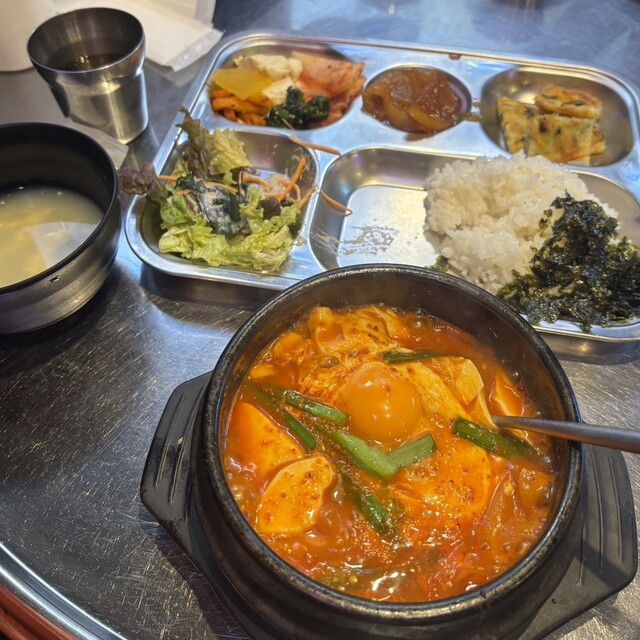 ランチメニュー注文で、サラダ、キムチ、ご飯、スープ、お惣菜などのセルフサービスがありお得だと思います。
