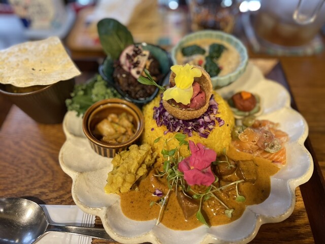 きまぐれプレート、さすがの美しさ。いわて牛の無水カレーはしっかり辛くて超好み。白いカレーはクリーミーで演出感満載。海カレーはしっかりと全体をまとめる。ちょこんと盛られたサーモンマリネ、ローストビーフも良いアクセント。全景はまさにサクラダファミリアかというくらいの芸術性。時々は贅沢、いいよね!ご馳走様でした!