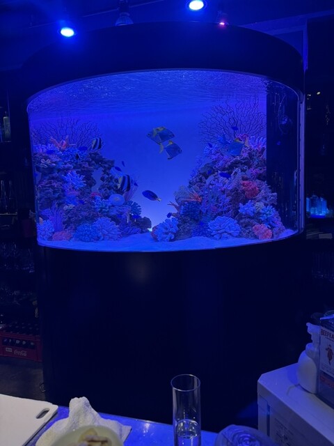店内中央には、巨大水槽が設置されており、熱帯魚が優雅に泳いでいます。