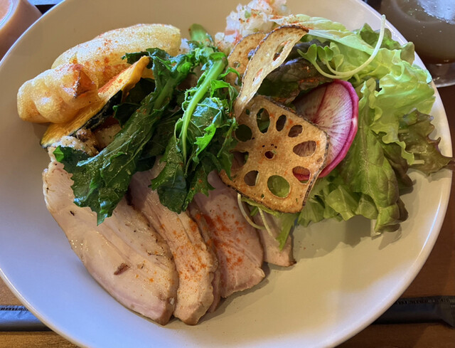 先月の今月でいきなりメニューが一新されるわけもなく、前回と同じく杉焼きランチのチキンとポークをシェアすることに。相変わらず混雑とは無縁のお店で、時間が穏やかに流れています。店内のレイアウトを眺めたり、そこここに置かれた本を読んだりして、自然と目がスマホから離れるから不思議。