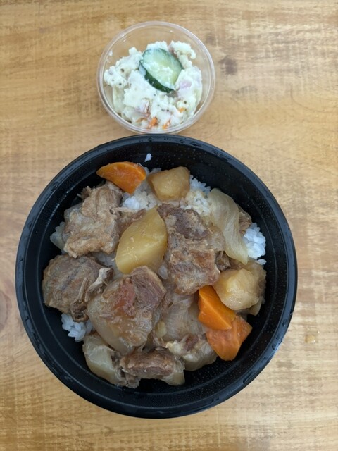 豚軟骨丼は、しっかり煮込んであるためコリコリ感はさほどでもなく、これなら軟骨苦手な人でもいけるんじゃないかなぁ。にんじん、じゃがいも、玉ねぎが入ったゴロゴロお肉の肉じゃがって感じで、味付けはかなりしっかりめです。