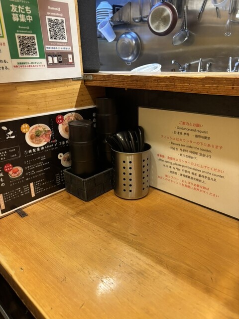 あいにく店内満席で先頭で待つこと5分程度でご案内頂きました店内はカウンターのみのシンプル設計。「女性が1人でも入れるラーメン屋」のコンセプトを体現して隣の席との間には間仕切りがされていて他人の目を気にせずにラーメンに真摯に向き合う環境整ってます待つこと7~8分で着丼✨️