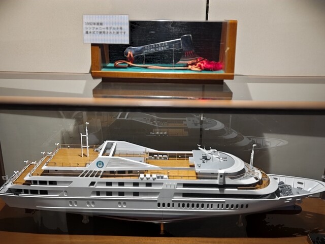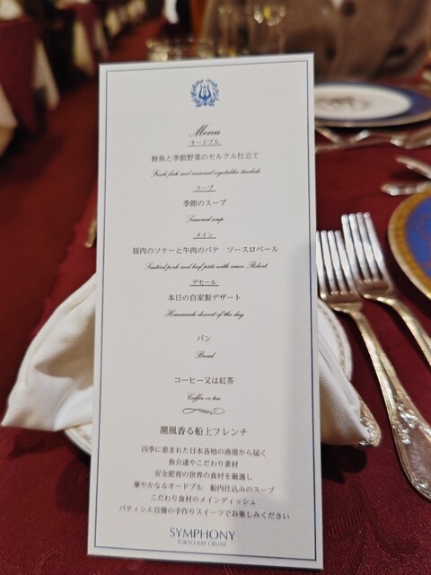 レストランのお部屋では航海中ずっとピアノの生演奏が行われていて抜群に良い雰囲気。メインは豚肉のソテーと牛肉のパテ。豚肉は脂ものっていてソースも美味しく素晴らしい。同時に牛肉も楽しめるのは素晴らしい。そして追加したケーキは濃厚な生クリームでこれも良かった。夕食後は外に出て夜景の撮影。サックスの演奏もありとても良かったです!