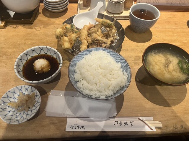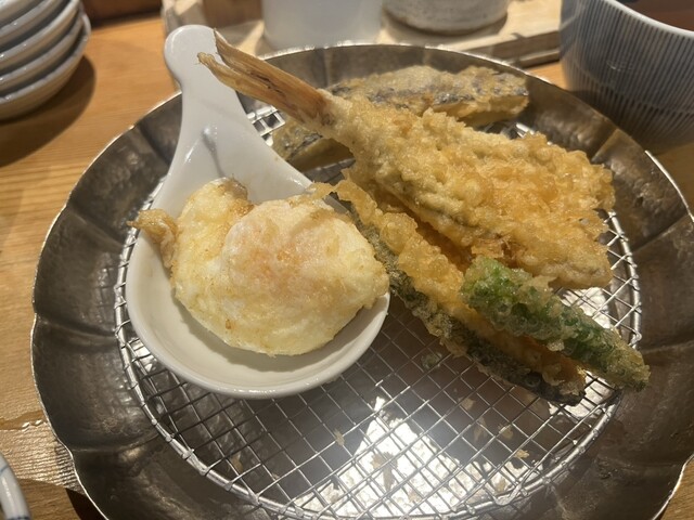 梅を注文。漬物たちの特にいか柚子がとても美味しかったです!天ぷらの一陣目は舞茸、エビ、いか等。いかは細かく切られていてかき揚げのようで私はこれが1番好きでした。濃いめの天つゆによく合います!