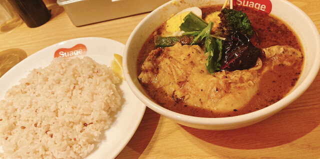 スパイスがしっかり効いたスープにイカスミとエビのテイストてアレンジできる 本場北海道でも海老だしのスープカレーが人気のようで渋谷で体感できるのは驚き嬉しかったです! 柔らかく煮込まれた人参、じゃがいもは串に刺さって食べやすい 鶏肉がホロホロに柔らかくとてもおいしかった ありがとうございました!
