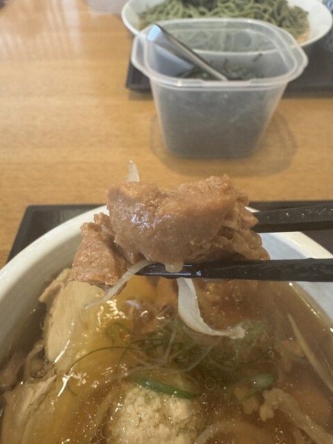 ずっと気になっていて、何度かきたことがあるけどいつも閉店になっていました。たまたま、お昼に来ることが出来たので良かった。混んでいて、記名して車で待つこと30分。いただいたのはザル2色かしわと天丼、連れは、抹茶ざる蕎麦です。かしわ汁は、つけ麺用で濃いめの汁で、中の鶏肉は3種類入っています。ちゃんと普通の汁も付いていました。天丼は、甘めの汁で食べやすかった。抹茶ざる蕎麦の汁は、少し薄味でした。色々な種類のそばが楽しめました。抹茶蕎麦は、すごく細くて他の蕎麦と食感も違ってとてもいいです。薬味が綺麗、一人ずつ蕎麦湯が付いていていいと思います。店内にジャズの様なBGMが流れていてモダンな感じがしました。量が少ないと勝手に思っていましたが、お腹が苦しくなりました。13:30に店を出るともう蕎麦が品切れで閉店になっていました。流石に人気店で閉店後もたくさん車が来ていました。