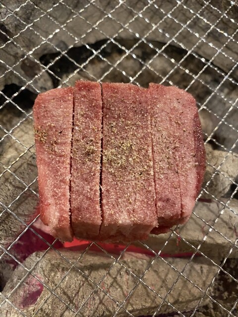 そして楽しみにしていたシャトーブリアン。美しくて切れ目が見えなかったのでまるごと焼くのかと思っていましたが。笑 しっかり食べやすいサイズでした。口に入れると上品な旨みが押し寄せてきます。脂の甘さを引き立ててくれる塩は、沖縄の屋我地島の塩にしました。旨塩ネギやきざみわさびと一緒にいただくのもいいですね。