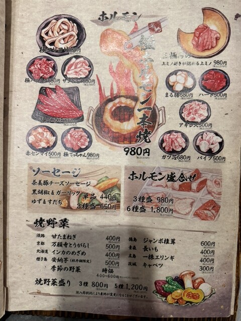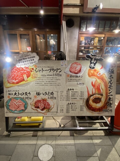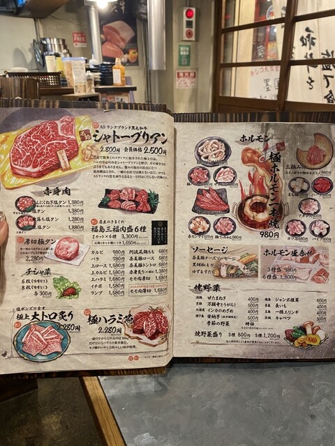 お肉はブランドにこだわらず、その時1番いいものを厳選して仕入れているそう。入り口の看板やメニューにも大々的に載っているA5ランクのシャトーブリアンが安価でいただけるのも驚きです。オーダーしたのは、旬やさいのきまぐれサラダ、ナムル盛、地鶏のレバ刺し、極みタン刺身、黒センマイ、厚切極タン、極ハラミ芯、シャトーブリアン、ホルモン3種盛り、ライス、ウーロン茶。
