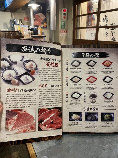 生ものも美味しかったですが、焼肉はここからスタート!こちらのお店にはタレがなく、素材にあう天然塩が9種類用意されています。霜降り肉用、赤身肉用、鶏豚肉用、焼き野菜用とあり、ミネラル豊富で体にいいのもうれしいです。