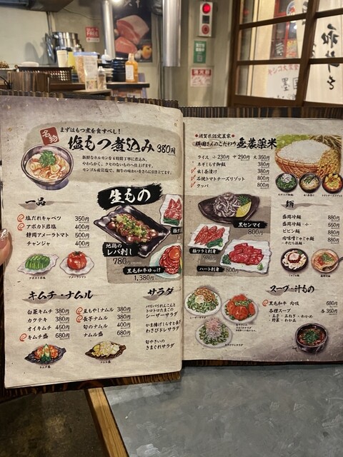 乾杯し旬やさいのきまぐれサラダからいただきます。白菜がメインで、みずみずしくて食感もよく美味しかったです。塩もつ煮込みは、新鮮なホルモンを6時間も丁寧に煮込んでいるそうで、ぷるぷるほろほろ柔らかく絶品。名物と記載があるのも納得です。