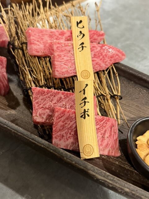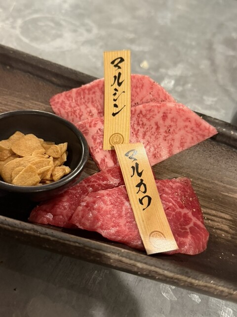 福島三福肉盛6種登場!インサイド、カイノミ、ヒウチ、イチボ、マルシン、マルカワというラインナップ。霜降りが美しくどれも上質。希少部位の腹横筋部分インサイドから焼きました。赤身の旨みが濃くお肉の味を楽しめます。カイノミも希少部位ですね。ステーキを食べているような感覚になります。ガーリックチップがよく合います。柔らかくしっとりとしたヒウチ。大好きなイチボは脂が甘く肉の旨みも強く刻み山葵と食べるのがオススメ。マルシンは上品で柔らかく、旨みの強いマルカワで締めました。大満足(^ ^)