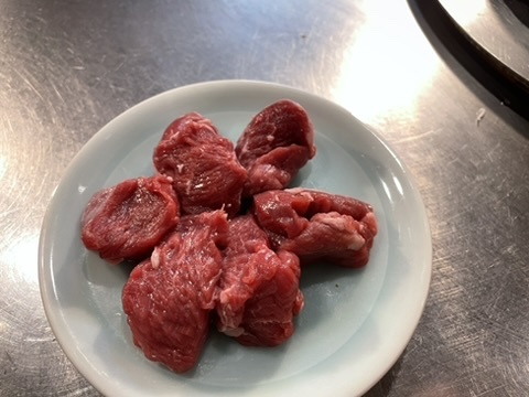 ・大きめの厚切り肉。噛みきれないため、ハサミでカットしてから食べるのがオススメ。