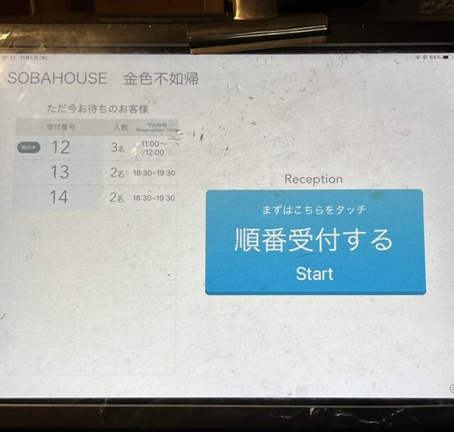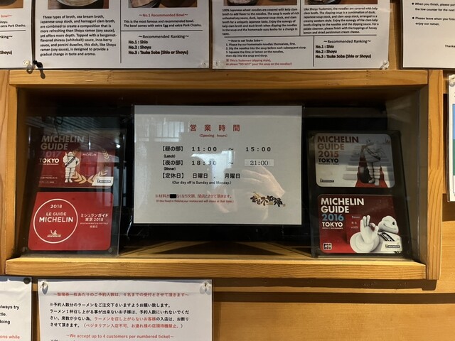 ・開店時刻と予約受付時刻は別(夜営業だと17:30受付、18:30開店)のため注意。17:30よりかなり前に並ぶのはNGと張り出しがあるが恐らく建前で、17:30になると(店員の案内も無く)店頭のタブレットで受付が開始される。
