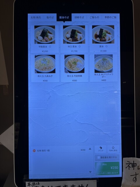 ・次回来店時は、味玉醤油(手揉み麺)か、味玉塩(細麺/手揉み麺)、味玉胡椒(手揉み麺)のいずれかに挑戦したい。