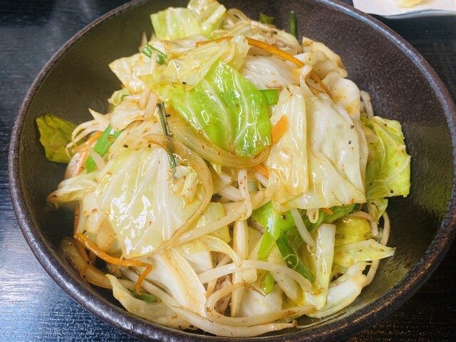 たっぷりのキャベツともやし、豚肉が豪快に盛られていて、中央の卵黄を崩すと一気に食欲をそそるビジュアル。