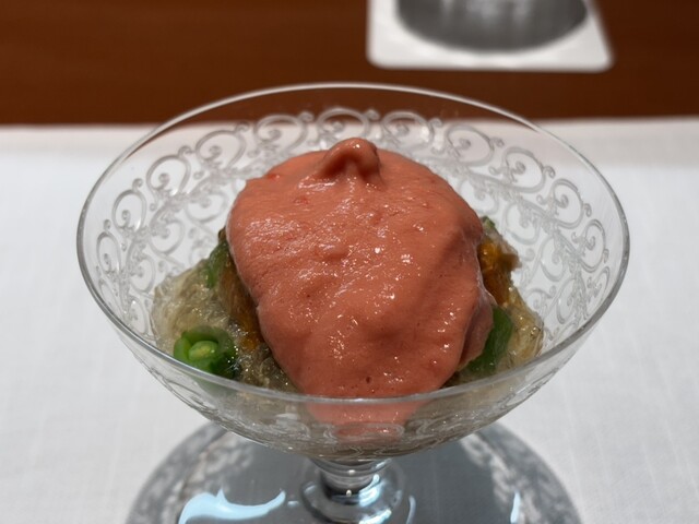 上に乗ってるのがフランス産のキャビア、添えてあるのが中国産のキャビア。どちらも美味しいです。フランス産の方が味にまろやかさがある感じでしょうか。どちらが好きかは好みに依る様な気がします。キャビアの旨みとビーフンの食感が合います!とてもおいしかったです!