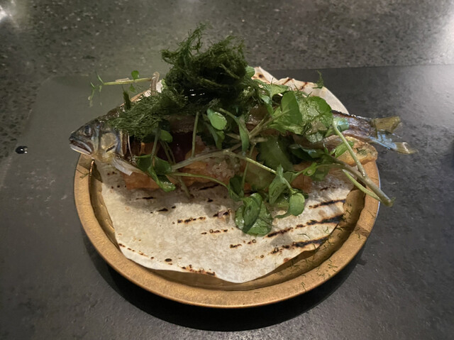 手前から食べ進めていくと七味のスパイス等で、味が変わる仕組み。甘さがありながらも、鮎もちゃんと感じる。今まで食べた事がない味わい。