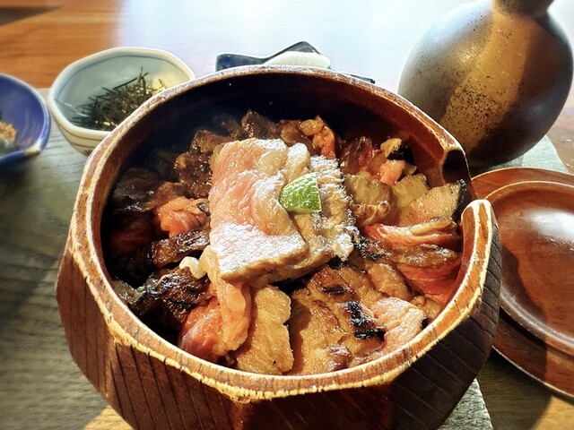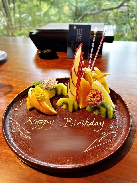 メインディッシュの和牛ひつまぶしは、ひつまぶし以外にもどんぶり状態でまずはそのまま食べる、薬味を追加するなどほかの楽しみ方があり、とても美味しかった♪味付けはお肉の素材の味が引き立つような感じで、出汁も美味しかった。お肉は噛めば噛むほど甘味とジューシーさが際立つ。誕生日プレートは果物だけではなく、ケーキもついていて、そこが嬉しいポイントだった!