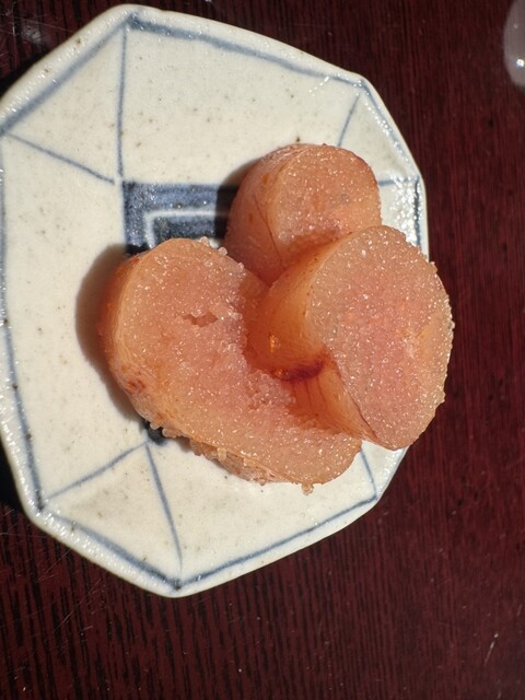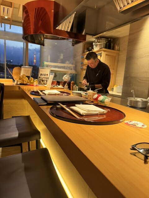 まず店内の雰囲気がおしゃれすぎて、入った瞬間から気分が上がります。縁起物がセンスよく飾られ、ワインセラーやシャンパンのお着物など細部までこだわりを感じる空間。高級感たっぷりなのに、カウンターに置かれた「ノコノコ」など遊び心もあって楽しい雰囲気です。カウンター席からは東京タワーが見え、特別な時間を過ごしている気分になります。デートにも特別な食事にも最適なお店です。