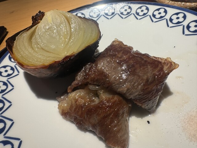 帆立フライは外カリ中ジュワで、タルタルをつけてもそのままでも絶品。ネギの炭火焼きは素材の甘みがしっかり出ていて、シンプルながら満足度高い一品。ステーキは脂がのっていてジューシーで、タレより塩で食べるのがおすすめ。お皿がエルメスなのも遊び心があって楽しいです。