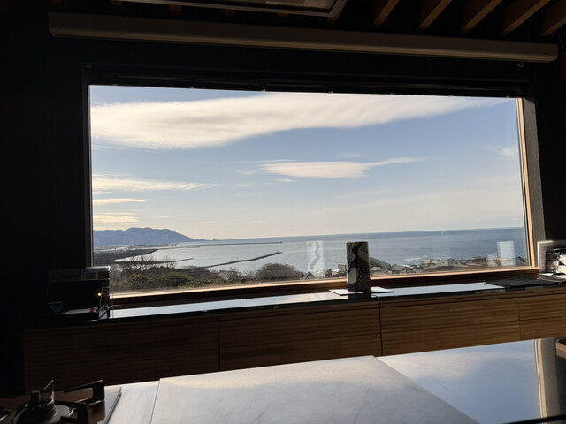 席はどこからでも横長の大きな窓から広大な海の景色を見ることができます(テーブルかカウンター選択可能)オーシャンブルーの景色を眺めていると窓枠は額縁、絵は景色に見えてきて‥まるで一枚の絵画を見てるように心奪われます