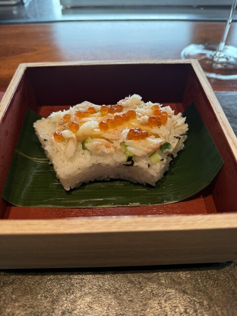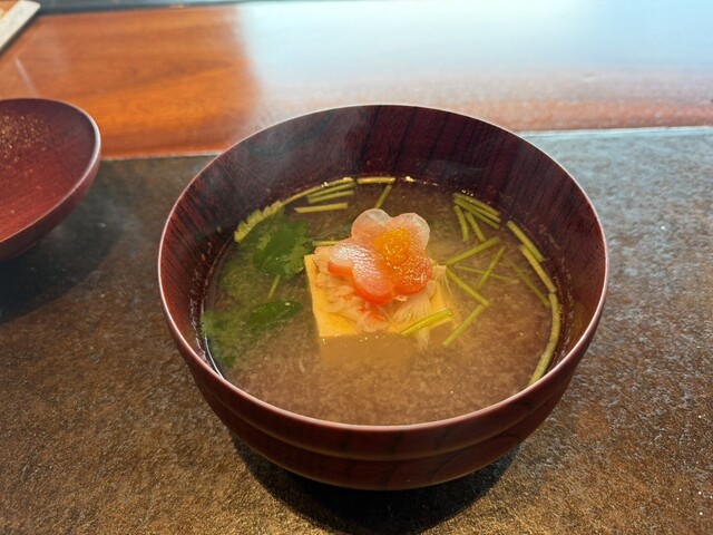 柚子がほっこりさせてくれる。お豆腐はたまご豆腐のような食感の中に少し蟹味噌の風味が見え隠れ、三つ葉の香りしっかり感じながら優しく染み込んだお出汁、蟹全部が優しい味で整っている