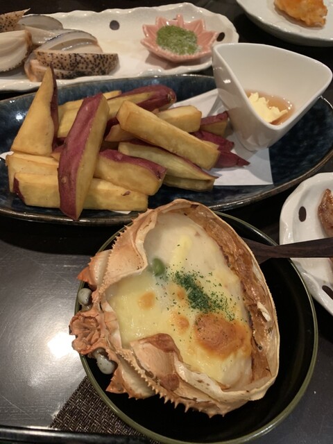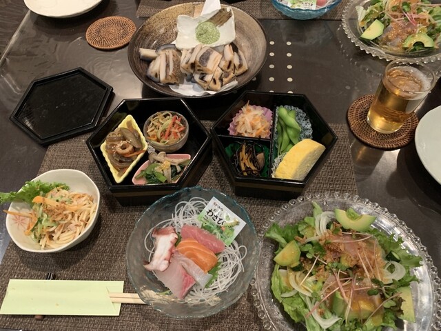 今回はお刺身、ヨダレポーク、さつまいも揚げスティック、唐揚げ、カニグラタン、アヒージョ、蓮根素揚げ、サラダ数種類、飲み放題、デザート、盛り沢山でどれも優しい味付けで美味しかったです。