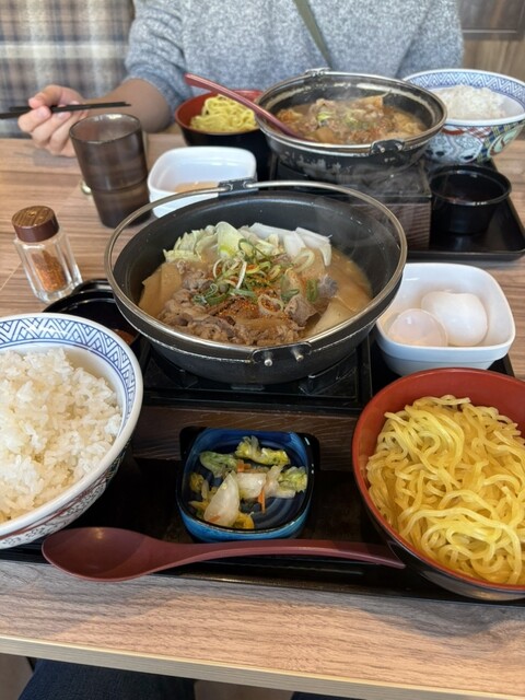 食べてみたい期間限定メニューを求めて、長男を誘って自宅から最も近い吉野家へ。こちらは席を先に確保して受付カウンターでオーダーするシステム。お茶もお冷も箸もスプーンもセルフ形式。長男も私もお目当ての牛肉玉ラーメン鍋膳(とんこつ、税込987円)ご飯増量(サービス)をオーダー。スープの量に差があったり、玉ねぎが生だったりとチェーン店特有の雑さはあるけれど、味も量も大満足。麺は鍋の締めに入れて楽しみました。