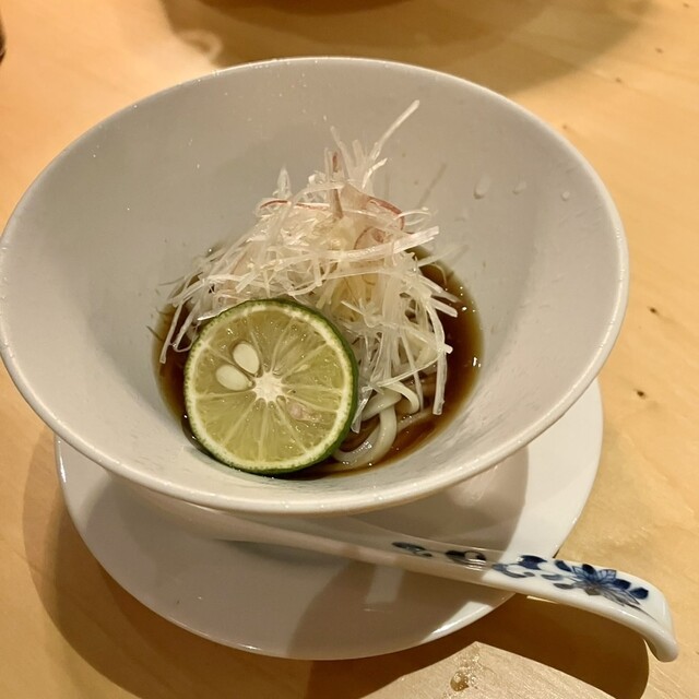 発酵白だしとポン酢の香りが広がり、細麺に出汁の旨みがよく絡む一品。