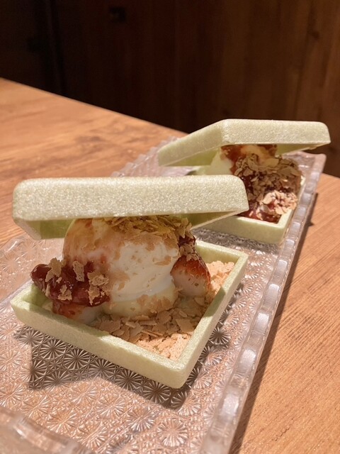 軽い抹茶風味の最中の中に、濃厚なジャージーミルクアイス。