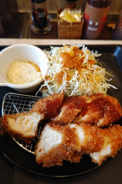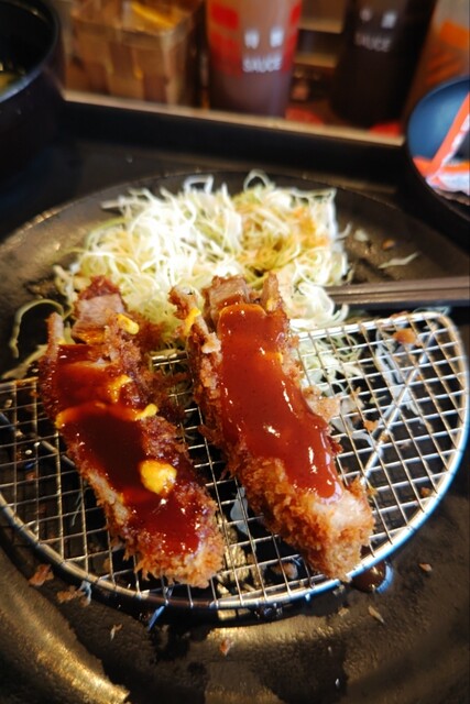 特製ソースのかかった、右の2切れ目を食べる、厚切り、衣が剥がれたが、柔らかく、ほのかに甘さもあって、旨い。