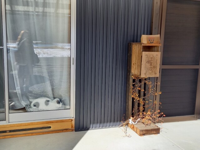 牛柄の猫ちゃんがいつも窓際で日向ぼっこを