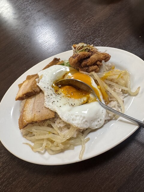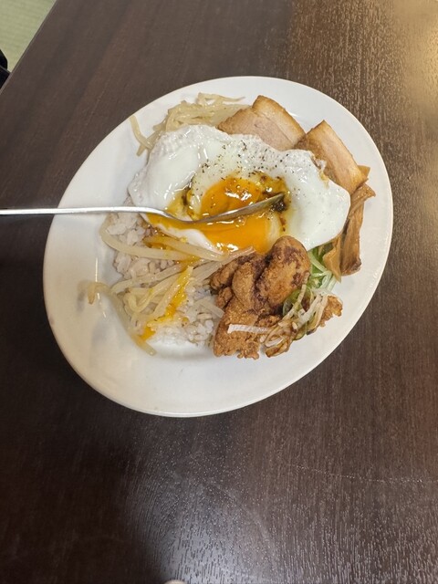 スタミナライス→唐揚げ、チャーシュー、メンマ、もやし、目玉焼きがのってます。