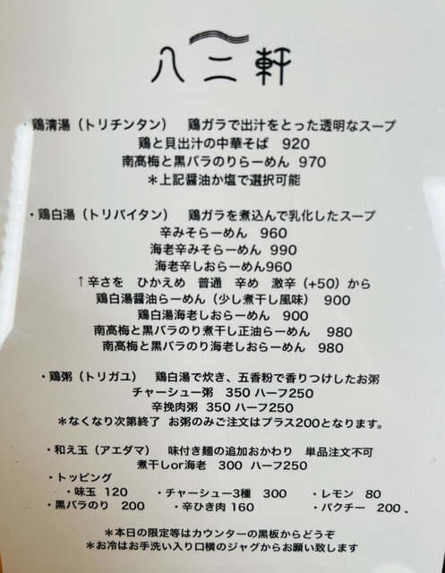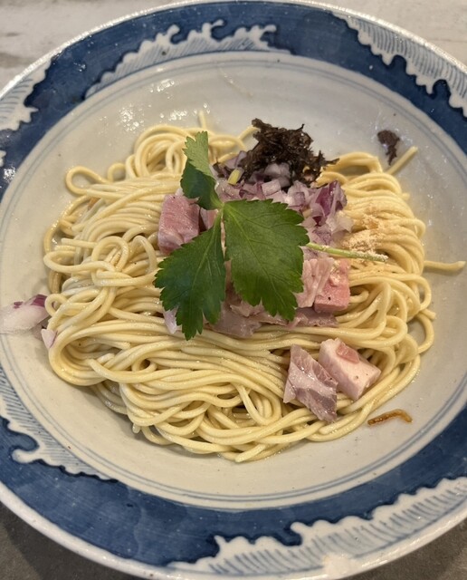 昼のみ営業でなかなか足が遠のいていた課題店に訪問。注文は牡蠣崩し正油つけめん1050円&海老シオ和え玉300円。つけ汁は、牡蠣出汁と鶏白湯の合わせ技。貝出汁の旨味であるコハク酸が主張しすぎることなく、鶏白湯がきちんと上手くまとめている。旨味×旨味の掛け合わせであるため、つけ汁単体では後半重くなってしまうが、大葉と刻み玉ねぎが入っているため口の中に爽やかさをもたらしてくれる。よく考えられたつけ汁である。麺は平打ち中太で、つけ汁に負けず麺との絡まり具合も良い。店員さんに確認したところ、麺量は並盛りで200gとのこと。海老シオ和え玉は、海老の旨みと香ばしい香り&塩タレ&細麺ぱっつんの低加水麺の構成。和え玉単体でも十分美味しいが、つけ汁につけても美味しい。南高梅と黒バラのり煮干正油らーめんを注文する客も多く、次回の来店時は試してみたい。