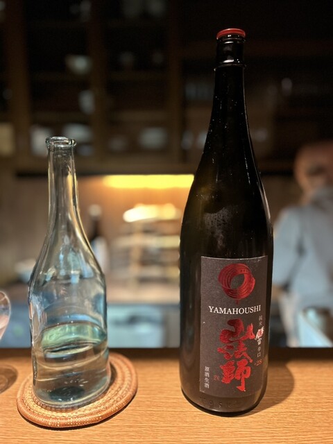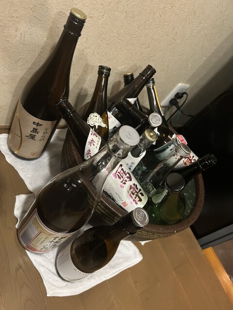今回はペアリングコースではなく、奥のお座敷で、「日本酒はどれでもお好きなだけどうぞ」とバケツ水にさして置いてある瓶を手に取って、手酌でクピクピ飲むスタイルです。ワンオペの店主さんは、「この料理にはどのお酒があいますか?」と尋ねると、丁寧かつまろやかにオススメしてくれます。