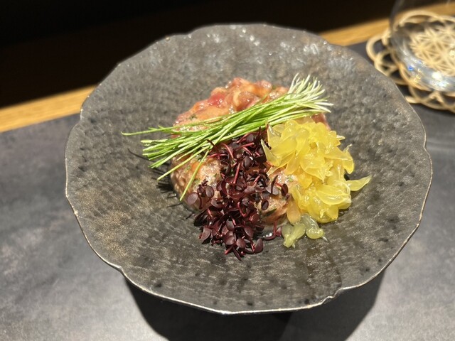 二月のコースもとっても美味しかったです。鮪酒盗と本鮪のとも和えは、超好みでした。それだけでお酒を何杯も行きたくなる味ですが、柑橘の強い酸味がスッキリとまとめてくれていて、ただ口でも美味しかったです