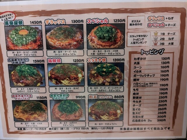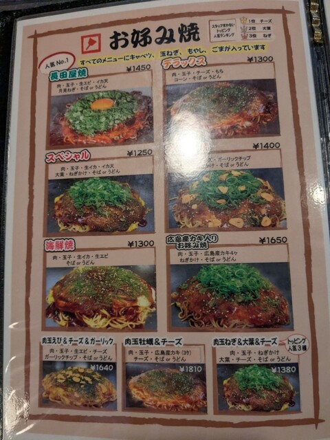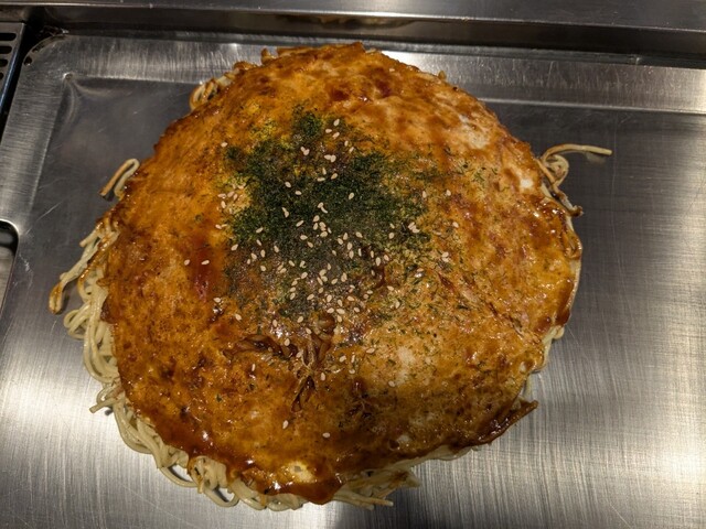 私は安定の長田屋焼き1450円、友人は肉玉そば860円をオーダーしました。豚骨スープを隠し味にしたお好み焼きは絶妙な味加減で生卵をくずして食べると味がマイルドになり味変が堪能できます。