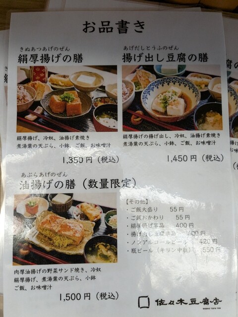 週替りの膳1350円(税込)をいただきました。厚揚げに肉味噌のあんがかけてあり、お豆腐のなめらかな食感に肉味噌の深い味わいがマッチして、とても美味しくいただけます。油揚げの素焼、煮湯葉の天婦羅など揚げ物が多いメニューになっていますが、不思議なほどあっさりといただけ身体に嬉しいお料理でした。