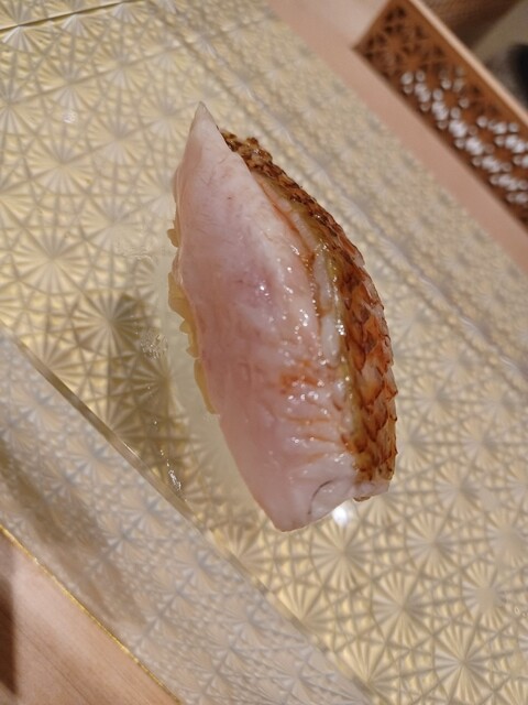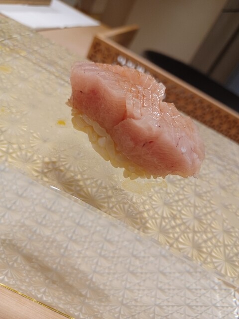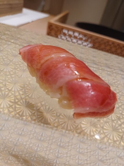 ここからは寿司を握ってもらうが、今までは、手渡しだった寿司が、なんと、クリスタルの寿司下駄に置かれて出てくるようになった。焼きたての穴子とか、手渡しだと熱すぎるのを気を使って始めたのだが、ビジュアル的にも、ちょっと宙に浮いている感じに見えて、まさに、未来の寿司! 詳しくは、言葉で語るより、写真を見て下さい。