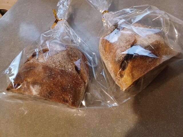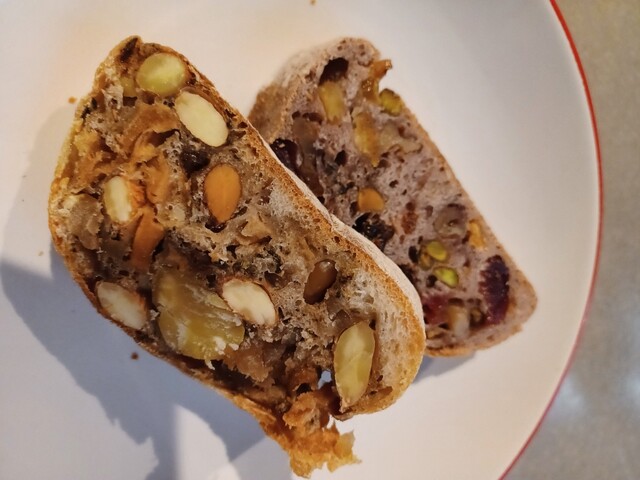 どちらも、栗やナッツ、果物、ピール、がふんだんに使われていて一口かじると口の中が喜びであふれる。フリュイルージュの方は、ブドウ果汁のみで加水されているのか、後味がさわやかで、子供の頃に絵本で読んだ、自然界には存在しない架空のパンの木になる果物パンの味がした。ああ、あのころ無性に食べたかったパンの木の実を食べる日が来るとは! なんだか夢を見ているような気分。