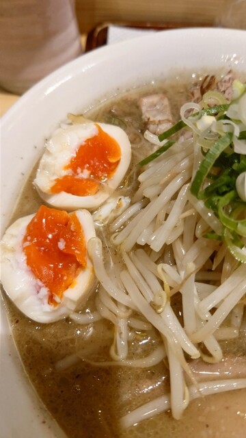 チャーシューも肉の旨味たっぷりホロトロですし煮玉子もオレンジの黄身が濃厚な旨味に程良い漬けがめちゃラーメンのウマさを引き立て太いのと細いメンマにもやしのシャキシャキ食感、蒲鉾が箸休めにサイコーかよヮ(゚д゚)ォ!